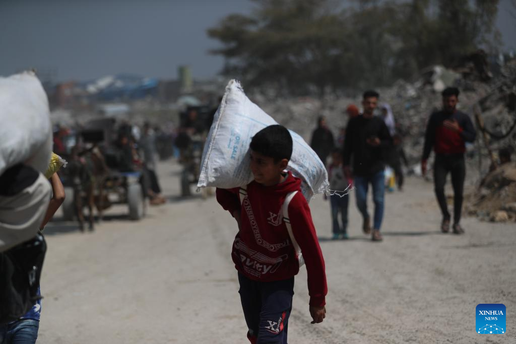 A Palestinian boy fleeing from the northern Gaza Strip city of Beit Hanoun is seen on a road in Gaza City, on March 18, 2025. Israel carried out deadly bombardments across the Gaza Strip early Tuesday, killing more than 400 people, as it vowed to intensify attacks if Hamas did not release the hostages still held in the enclave. After the deadly attacks, the Israeli army issued evacuation orders, prompting Palestinians to flee in chaos. Israeli military's Arabic-language spokesperson, Avichay Adraee, called on civilians to move west. A map he posted on social media platform X marked in red the entire perimeter around Gaza, designating it as a "dangerous combat zone." The targeted areas included the city of Beit Hanoun, the town of Khuza'a, and the Abasan suburbs of Khan Younis. (Photo by Mahmoud Zaki/Xinhua)