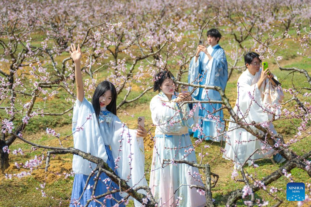 Tourists take pictures of blossoms at a park in Xiaogan City, central China's Hubei Province, March 18, 2025. (Xinhua/Xiao Yijiu)
