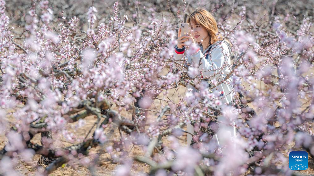 A tourist takes pictures of blossoms in Xiaogan City, central China's Hubei Province, March 18, 2025. (Xinhua/Xiao Yijiu)