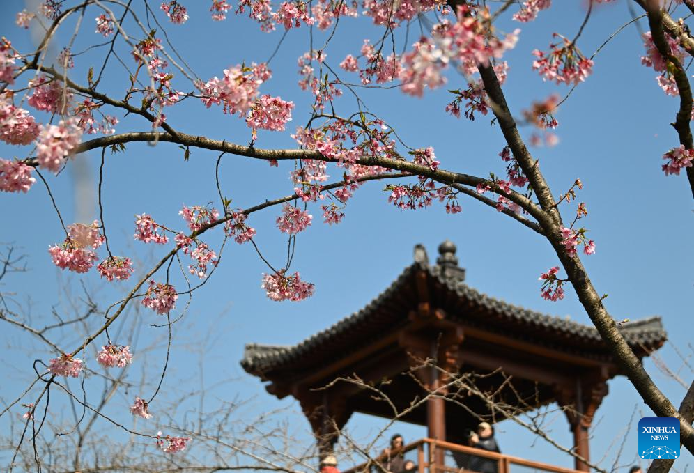 Tourists enjoy the scenery of blossoms at a park in Xiaogan City, central China's Hubei Province, March 18, 2025. (Xinhua/Xiao Yijiu)