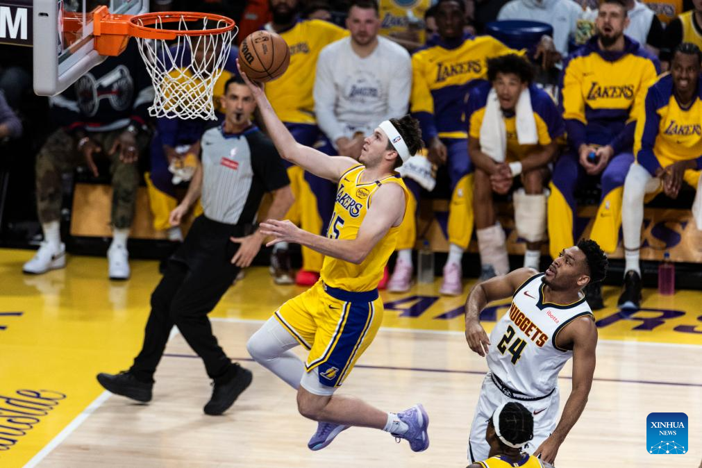 Los Angeles Lakers' Austin Reaves (L) goes for a layup during the 2024-2025 NBA regular season match between Los Angeles Lakers and Denver Nuggets in Los Angeles, the United States, March 19, 2025. (Photo by Ringo Chiu/Xinhua)