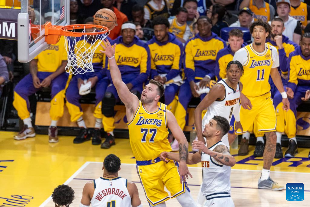 Los Angeles Lakers' Luka Doncic (C) goes for a layup during the 2024-2025 NBA regular season match between Los Angeles Lakers and Denver Nuggets in Los Angeles, the United States, March 19, 2025. (Photo by Ringo Chiu/Xinhua)
