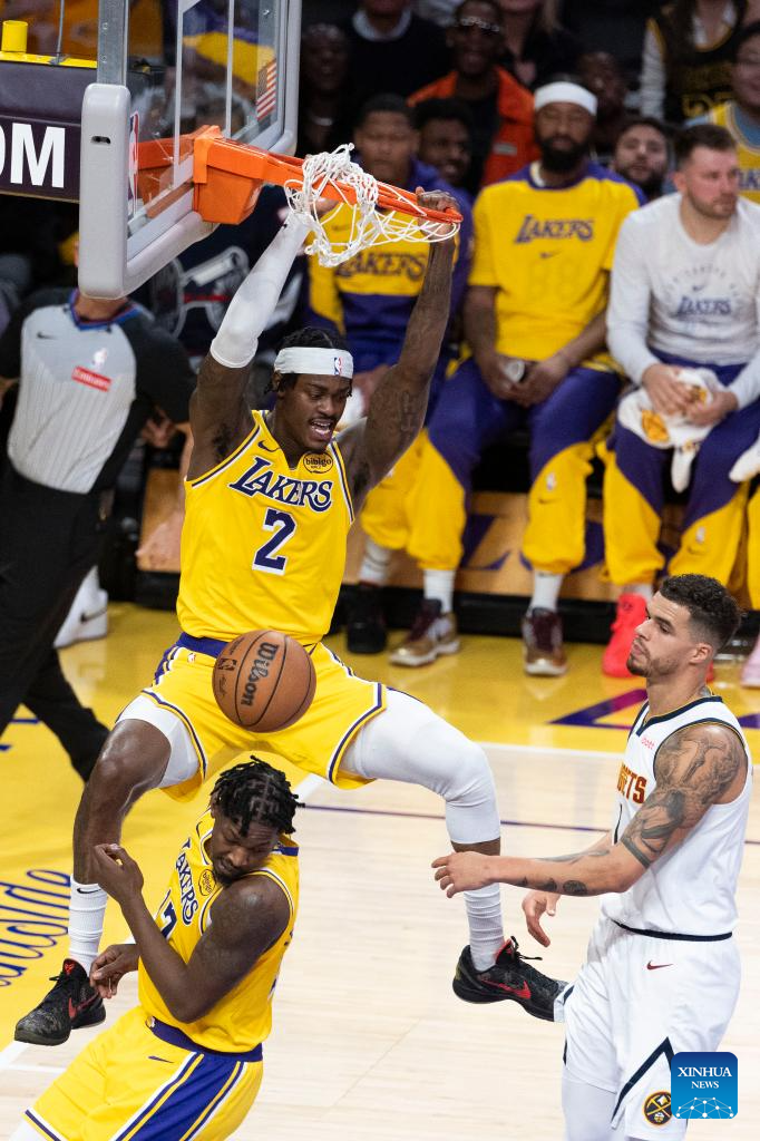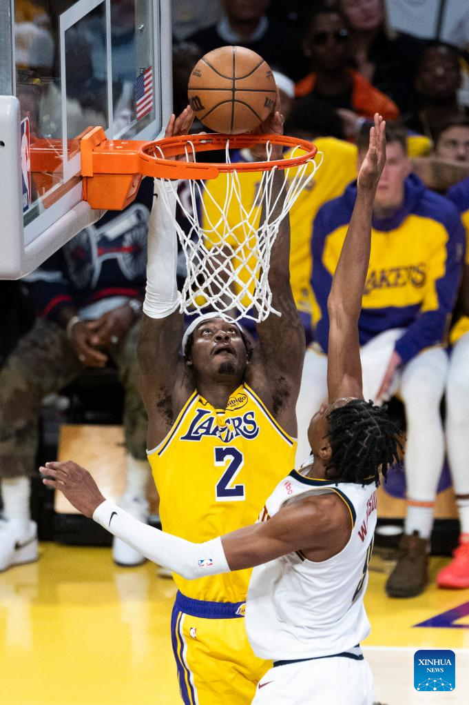 Los Angeles Lakers' Jarred Vanderbilt (L, top) dunks during the 2024-2025 NBA regular season match between Los Angeles Lakers and Denver Nuggets in Los Angeles, the United States, March 19, 2025. (Photo by Ringo Chiu/Xinhua)