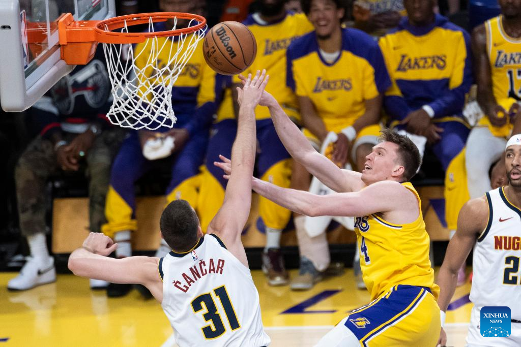 Los Angeles Lakers' Dalton Knecht (C) shoots against Denver Nuggets' Vlatko Cancar (L) during the 2024-2025 NBA regular season match between Los Angeles Lakers and Denver Nuggets in Los Angeles, the United States, March 19, 2025. (Photo by Ringo Chiu/Xinhua)