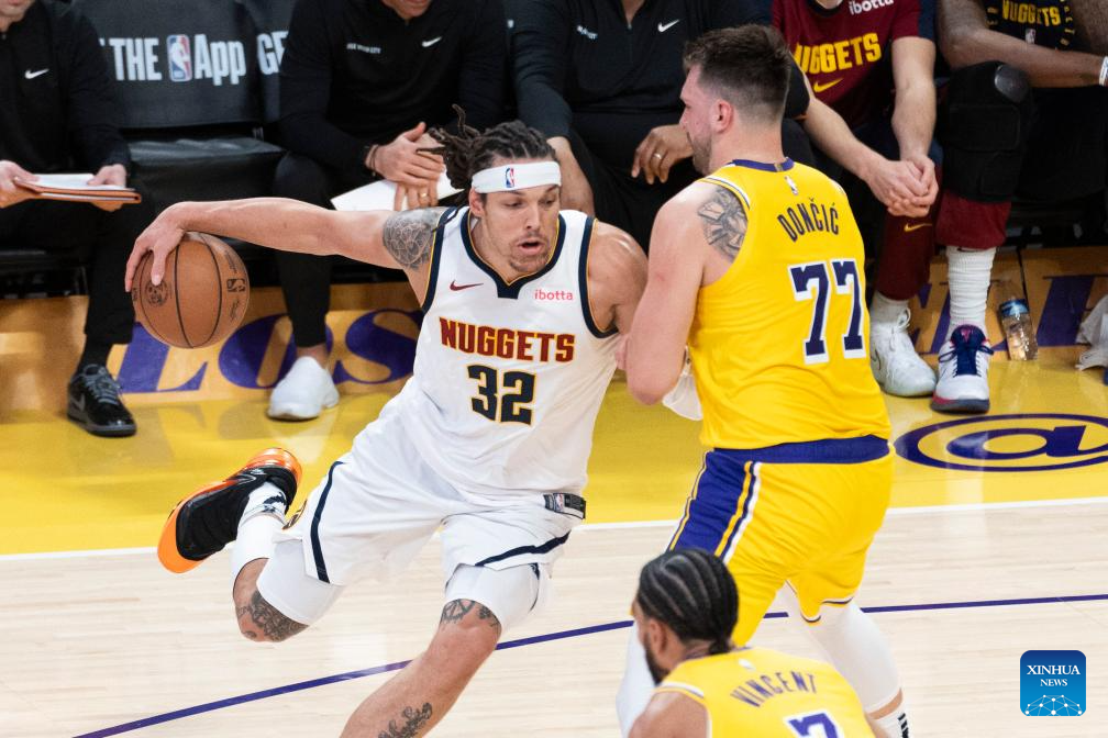 Denver Nuggets' Aaron Gordon (L) drives against Los Angeles Lakers' Luka Doncic during the 2024-2025 NBA regular season match between Los Angeles Lakers and Denver Nuggets in Los Angeles, the United States, March 19, 2025. (Photo by Ringo Chiu/Xinhua)