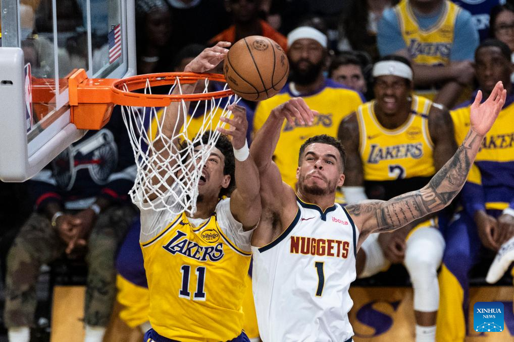 Los Angeles Lakers' Jarred Vanderbilt (L) dunks against Denver Nuggets' Peyton Watson during the 2024-2025 NBA regular season match between Los Angeles Lakers and Denver Nuggets in Los Angeles, the United States, March 19, 2025. (Photo by Ringo Chiu/Xinhua)