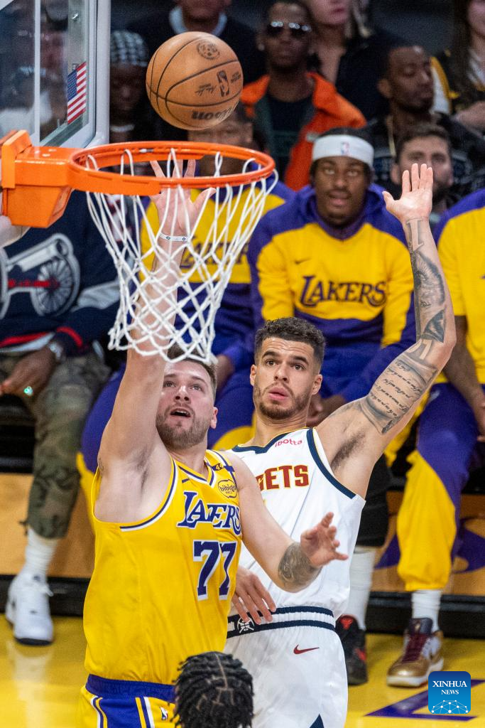 Los Angeles Lakers' Luka Doncic (L) shoots during the 2024-2025 NBA regular season match between Los Angeles Lakers and Denver Nuggets in Los Angeles, the United States, March 19, 2025. (Photo by Ringo Chiu/Xinhua)