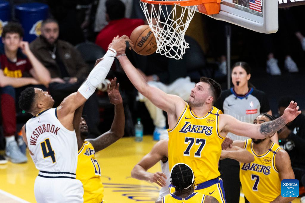 Denver Nuggets' Russell Westbrook (top L) vies with Los Angeles Lakers' Luka Doncic (top R) during the 2024-2025 NBA regular season match between Los Angeles Lakers and Denver Nuggets in Los Angeles, the United States, March 19, 2025. (Photo by Ringo Chiu/Xinhua)