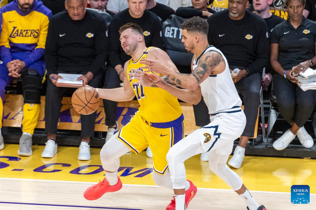 Los Angeles Lakers' Luka Doncic (L) drives against Denver Nuggets' Michael Porter Jr. during the 2024-2025 NBA regular season match between Los Angeles Lakers and Denver Nuggets in Los Angeles, the United States, March 19, 2025. (Photo by Ringo Chiu/Xinhua)
