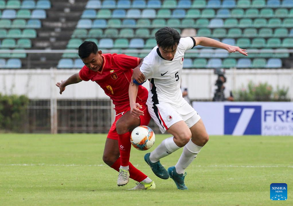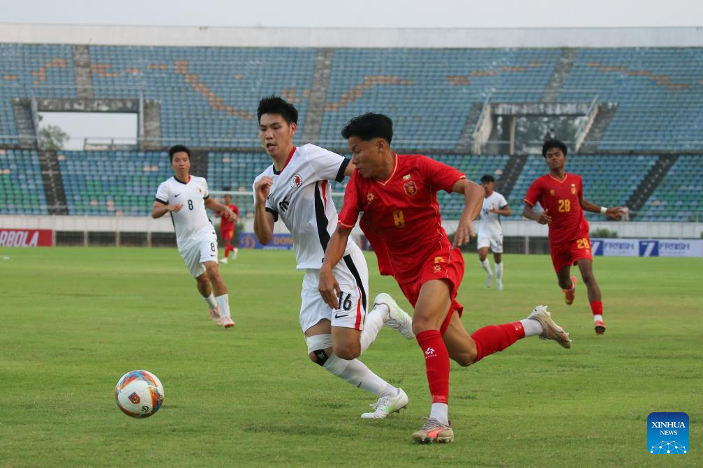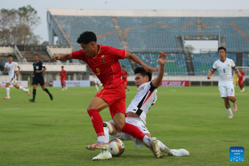 Zwe Manh Thar (L) of Myanmar vies with Wong Ching-In Samuel of China's Hong Kong during an international U-22 friendly match between Myanmar and China's Hong Kong in Yangon, Myanmar, March 19, 2025. (Xinhua/Myo Kyaw Soe)