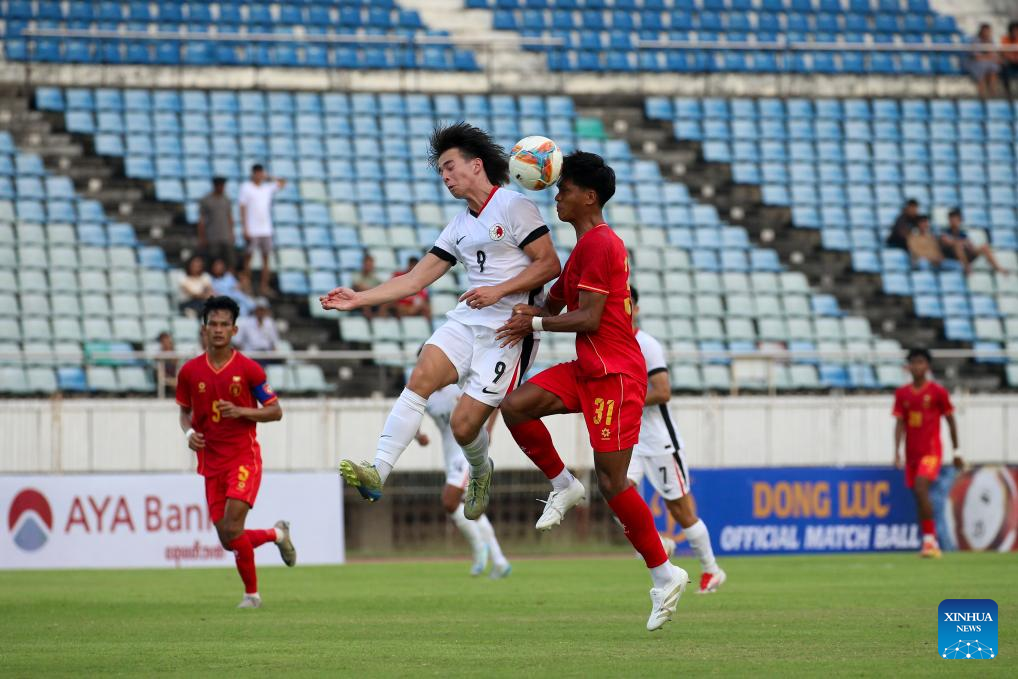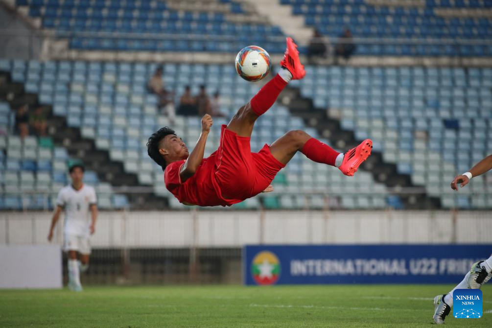 Shine Wanna Aung of Myanmar competes during an international U-22 friendly match between Myanmar and China's Hong Kong in Yangon, Myanmar, March 19, 2025. (Xinhua/Myo Kyaw Soe)