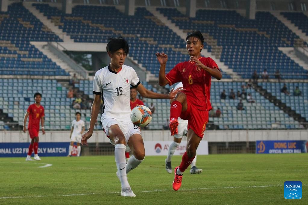 Kam Chi-Kin Jason (L) of China's Hong Kong vies with Shine Wanna Aung of Myanmar during an international U-22 friendly match between Myanmar and China's Hong Kong in Yangon, Myanmar, March 19, 2025. (Xinhua/Myo Kyaw Soe)