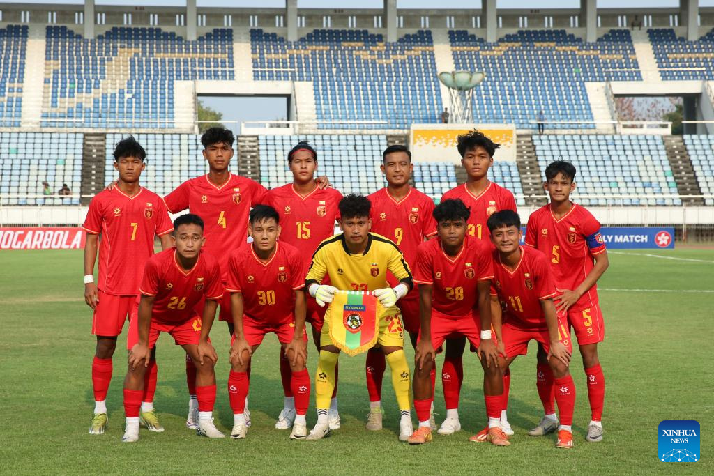 Players of Myanmar line up before an international U-22 friendly match between Myanmar and China's Hong Kong in Yangon, Myanmar, March 19, 2025. (Xinhua/Myo Kyaw Soe)