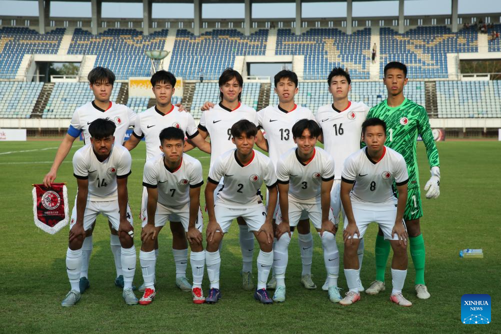 Players of China's Hong Kong line up before an international U-22 friendly match between Myanmar and China's Hong Kong in Yangon, Myanmar, March 19, 2025. (Xinhua/Myo Kyaw Soe)