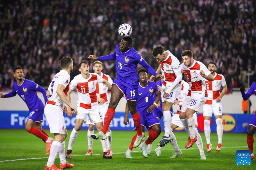 Ibrahima Konate (top L) of France heads for the ball during the UEFA Nations League quarterfinal 1st leg football match between Croatia and France in Split, Croatia, on March 20, 2025. (Photo by Zvonimir Barisin/PIXSELL via Xinhua)