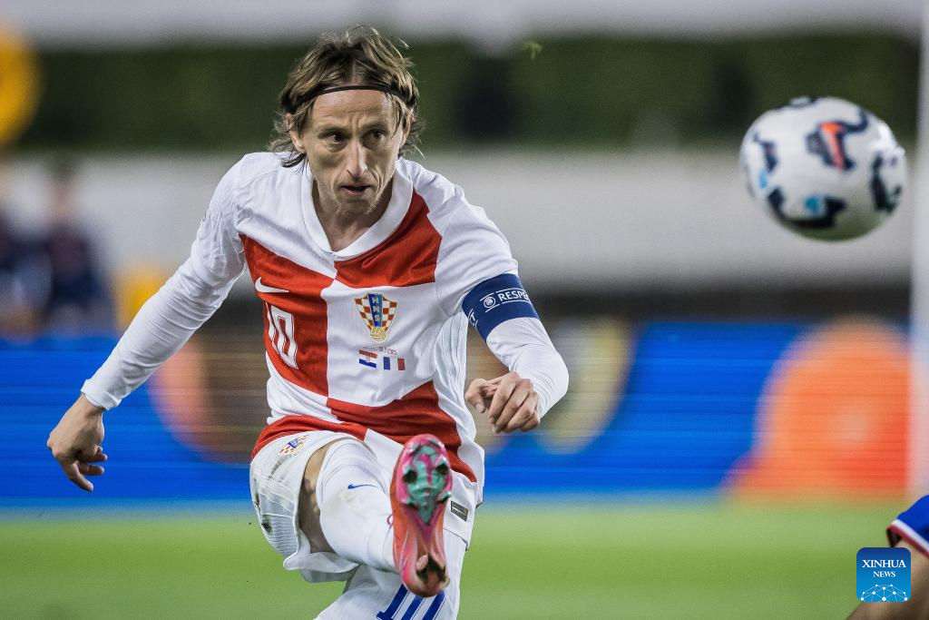 Luka Modric of Croatia shoots during the UEFA Nations League quarterfinal 1st leg football match between Croatia and France in Split, Croatia, on March 20, 2025. (Photo by Zvonimir Barisin/PIXSELL via Xinhua)