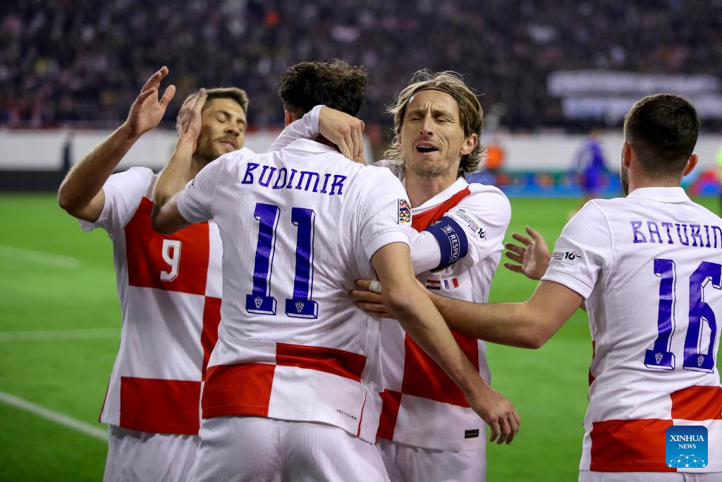 Ante Budimir (2nd L) of Croatia celebrates his goal with Luka Modric (2nd R) during the UEFA Nations League quarterfinal 1st leg football match between Croatia and France in Split, Croatia, on March 20, 2025. (Photo by Zvonimir Barisin/PIXSELL via Xinhua)