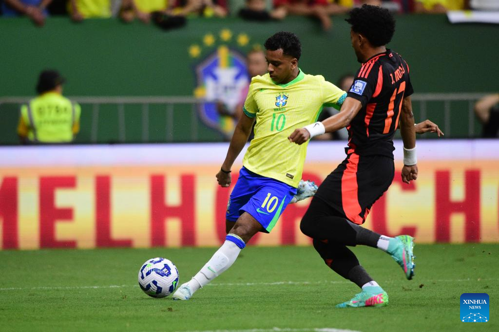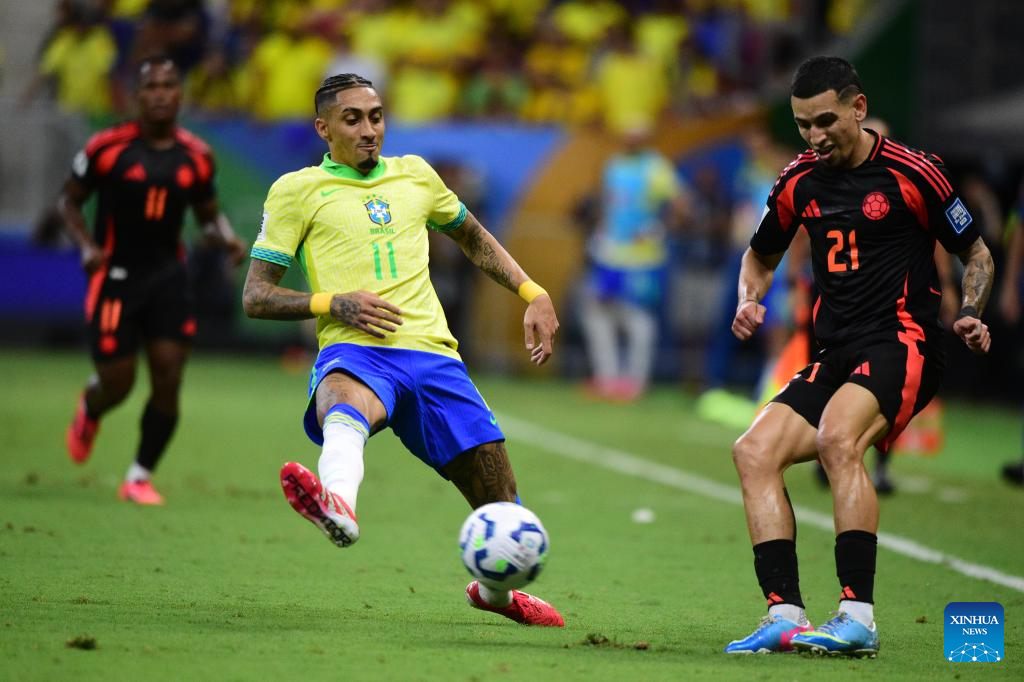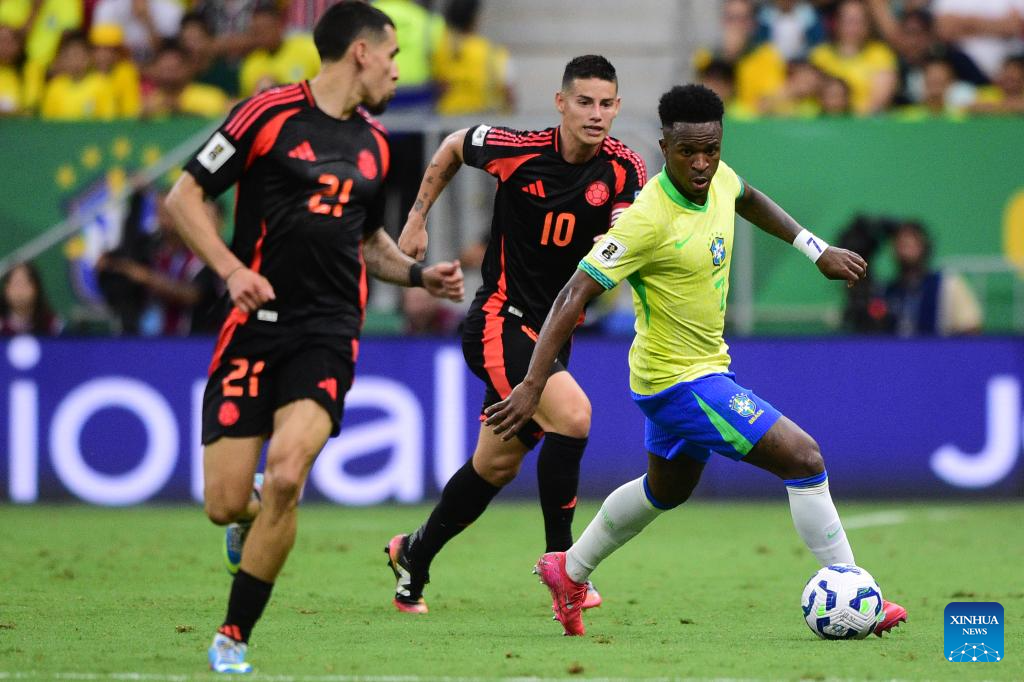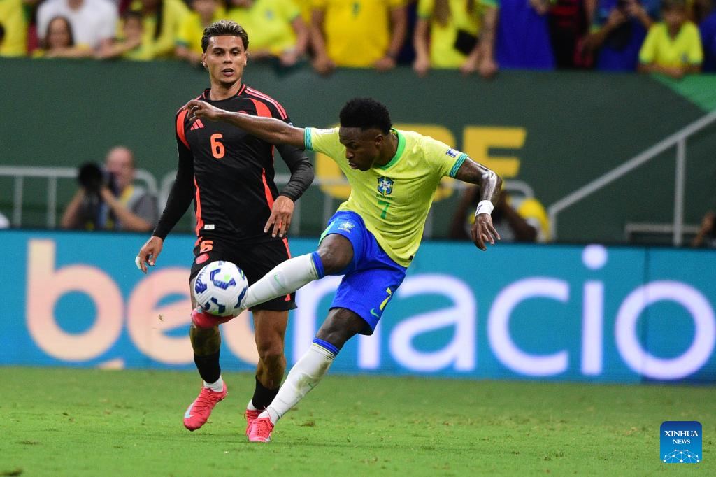 Vinicius Junior (R) of Brazil controls the ball during the 2026 FIFA World Cup Latin American Qualifier football match between Brazil and Colombia in Brasilia, Brazil, March 20, 2025. (Photo by Lucio Tavora/Xinhua)