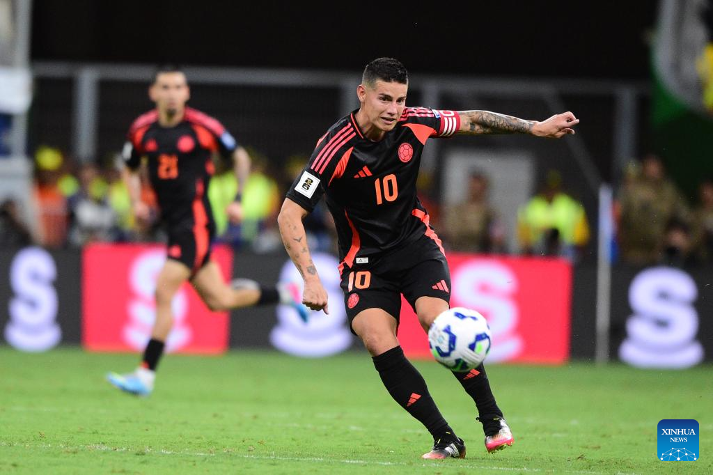 James Rodrigues (R) of Colombia shoots during the 2026 FIFA World Cup Latin American Qualifier football match between Brazil and Colombia in Brasilia, Brazil, March 20, 2025. (Photo by Lucio Tavora/Xinhua)