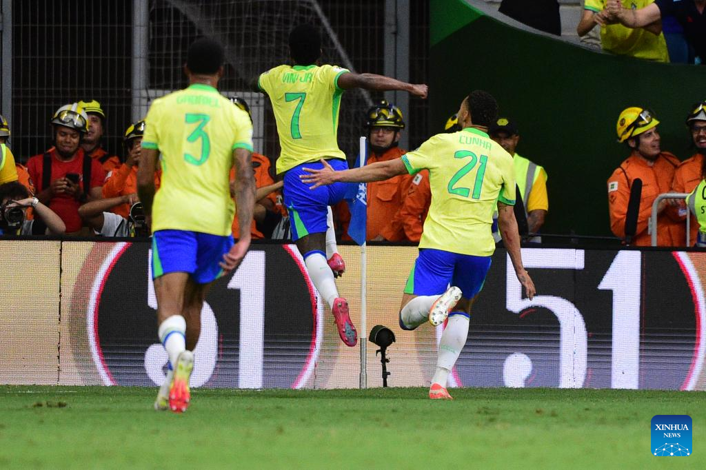 Vinicius Junior (C) of Brazil celebrates a goal during the 2026 FIFA World Cup Latin American Qualifier football match between Brazil and Colombia in Brasilia, Brazil, March 20, 2025. (Photo by Lucio Tavora/Xinhua)