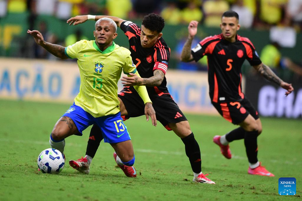 Wesley (L) of Brazil competes with Luis Diaz (C) of Colombia during the 2026 FIFA World Cup Latin American Qualifier football match between Brazil and Colombia in Brasilia, Brazil, March 20, 2025. (Photo by Lucio Tavora/Xinhua)