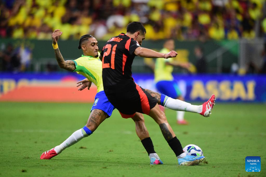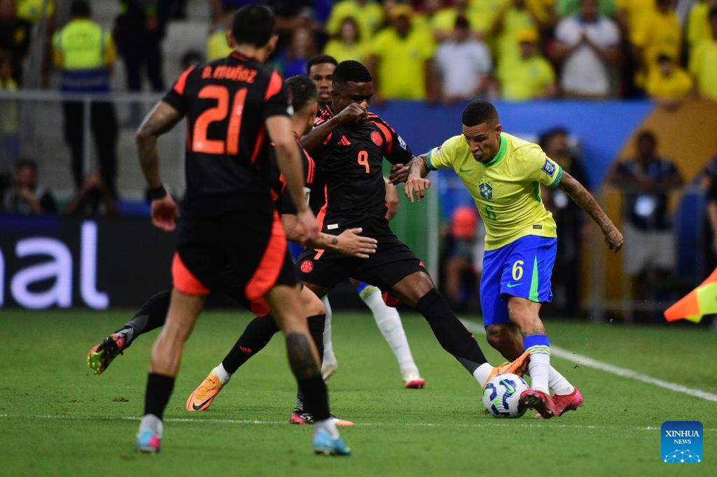 Guilherme Arana (1st R) from Brazil breaks through during the 2026 FIFA World Cup Latin American Qualifier football match between Brazil and Colombia in Brasilia, Brazil, March 20, 2025. (Photo by Lucio Tavora/Xinhua)