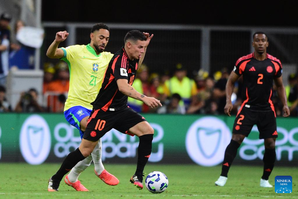 James Rodrigues (C) of Colombia vies with Matheus Cunha (L) of Brazil during the 2026 FIFA World Cup Latin American Qualifier football match between Brazil and Colombia in Brasilia, Brazil, March 20, 2025. (Photo by Lucio Tavora/Xinhua)