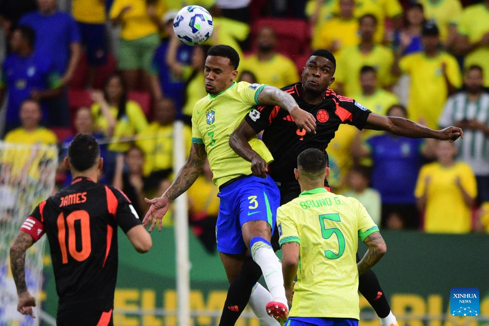 Gabriel Magalhaes (2nd L) of Brazil heads for the ball during the 2026 FIFA World Cup Latin American Qualifier football match between Brazil and Colombia in Brasilia, Brazil, March 20, 2025. (Photo by Lucio Tavora/Xinhua)