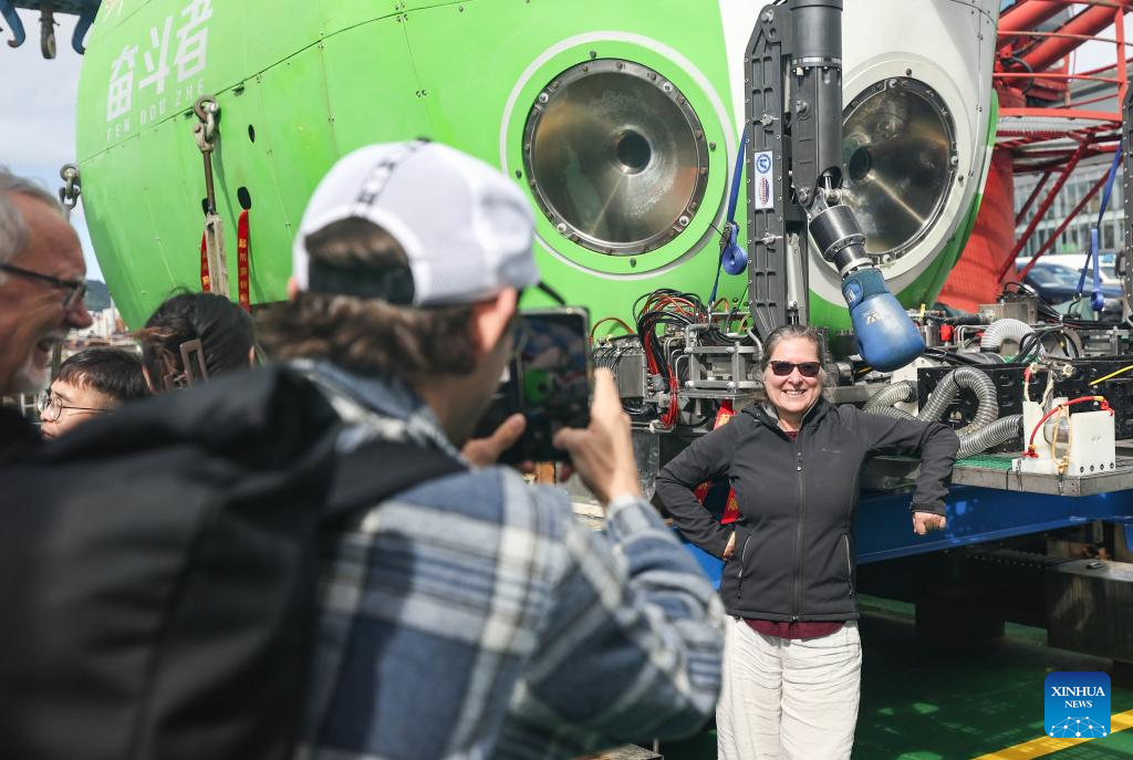 A visitor poses for photo with deep-sea manned submersible Fendouzhe (Striver) aboard Tansuo-1 research vessel during a Concluding Open Day of a joint China-New Zealand dive expedition in Wellington, New Zealand, March 21, 2025. Chinese and New Zealand scientists have successfully concluded a groundbreaking collaborative dive expedition to the Puysegur Trench, supported by the Chinese Academy of Sciences (CAS) Global Trench Exploration and Diving program (Global TREnD).