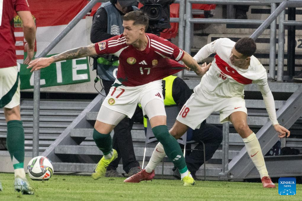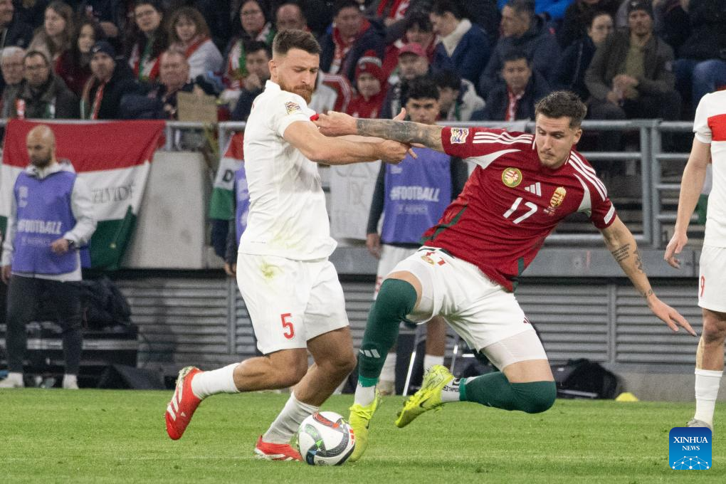 Tamas Nikitscher (L) of Hungary vies with Mert Muldur of Türkiye during the UEFA Nations League play-offs 2nd leg football match between Hungary and Türkiye in Budapest, Hungary on March 23, 2025. (Photo by Attila Volgyi/Xinhua)