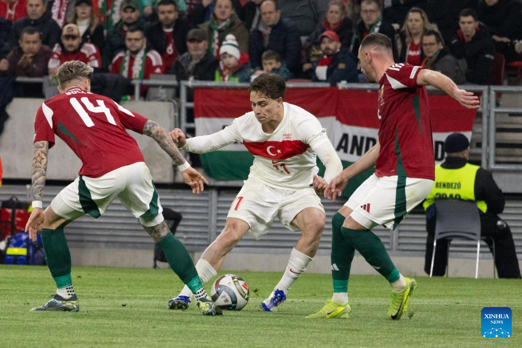 Kenan Yildiz (C) of Türkiye vies with Bendeguz Bolla (L) and Attila Fiola of Hungary during the UEFA Nations League play-offs 2nd leg football match between Hungary and Türkiye in Budapest, Hungary on March 23, 2025. (Photo by Attila Volgyi/Xinhua)