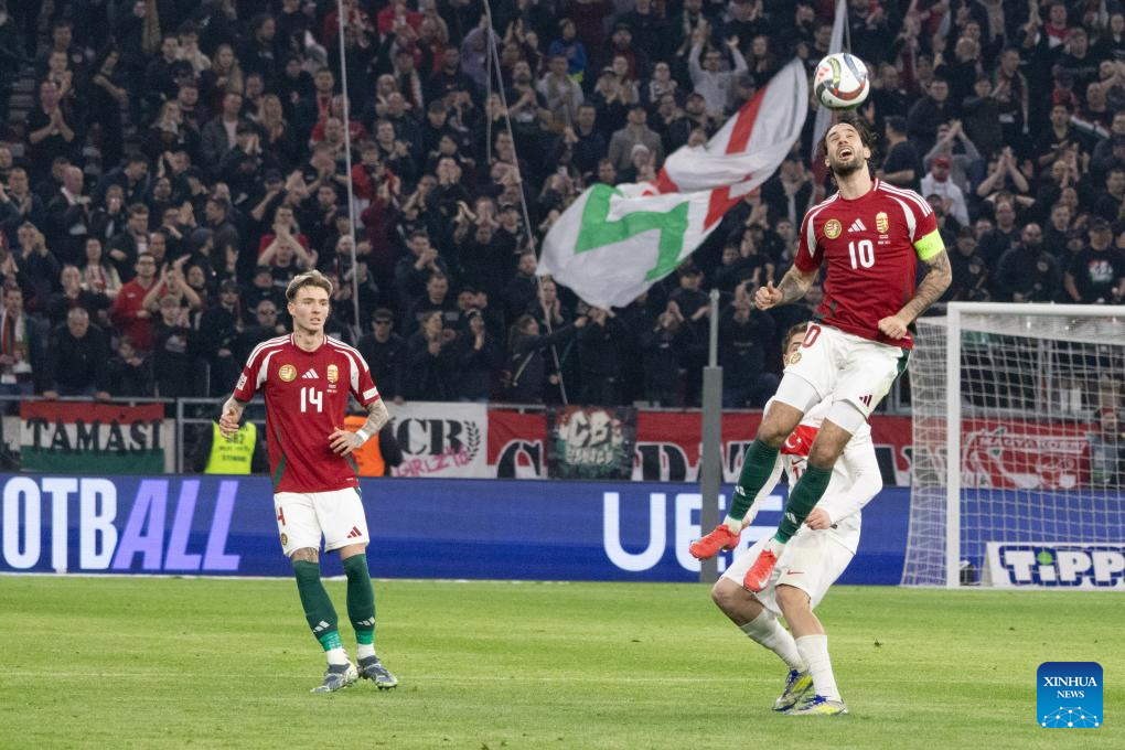 Dominik Szoboszlai (Top) of Hungary vies for a header during the UEFA Nations League play-offs 2nd leg football match between Hungary and Türkiye in Budapest, Hungary on March 23, 2025. (Photo by Attila Volgyi/Xinhua)
