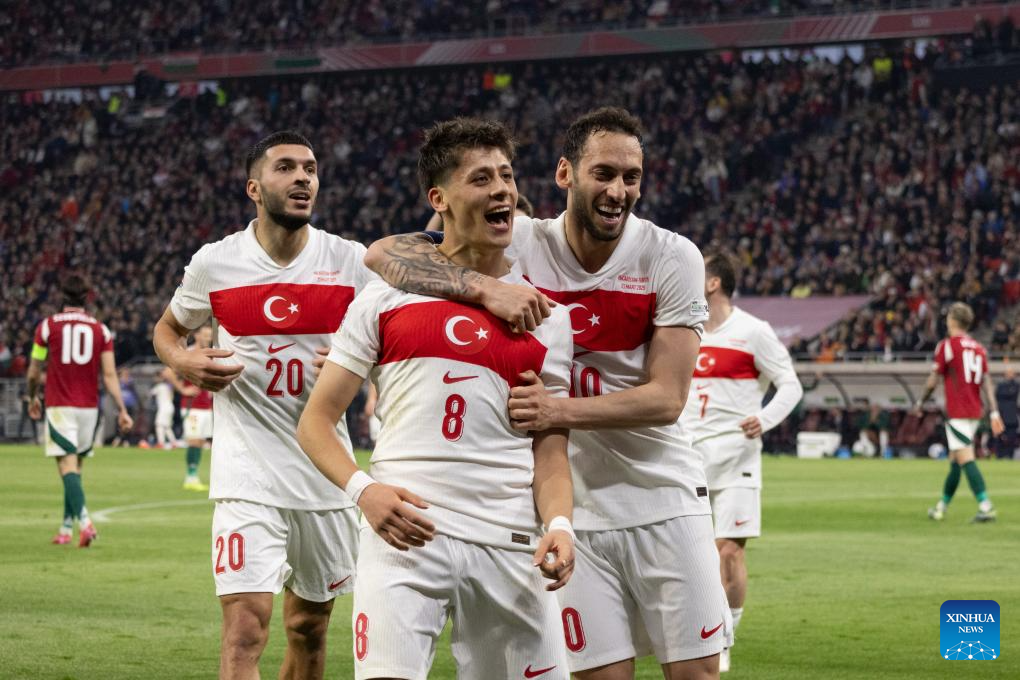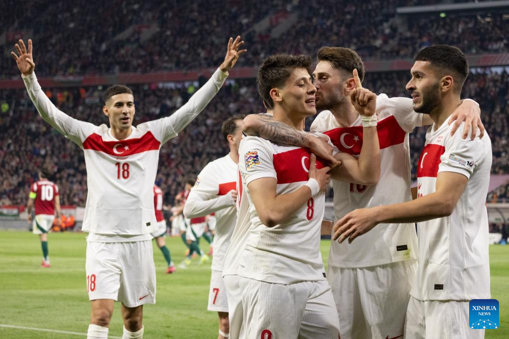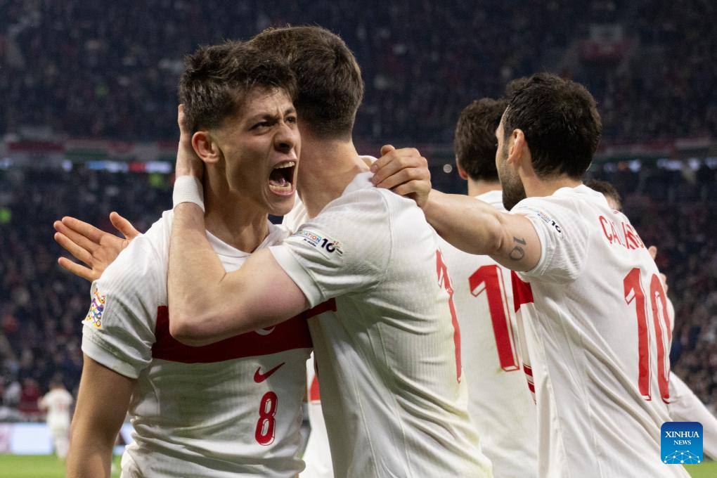 Arda Guler (L) of Türkiye celebrates scoring with teammates during the UEFA Nations League play-offs 2nd leg football match between Hungary and Türkiye in Budapest, Hungary on March 23, 2025. (Photo by Attila Volgyi/Xinhua)