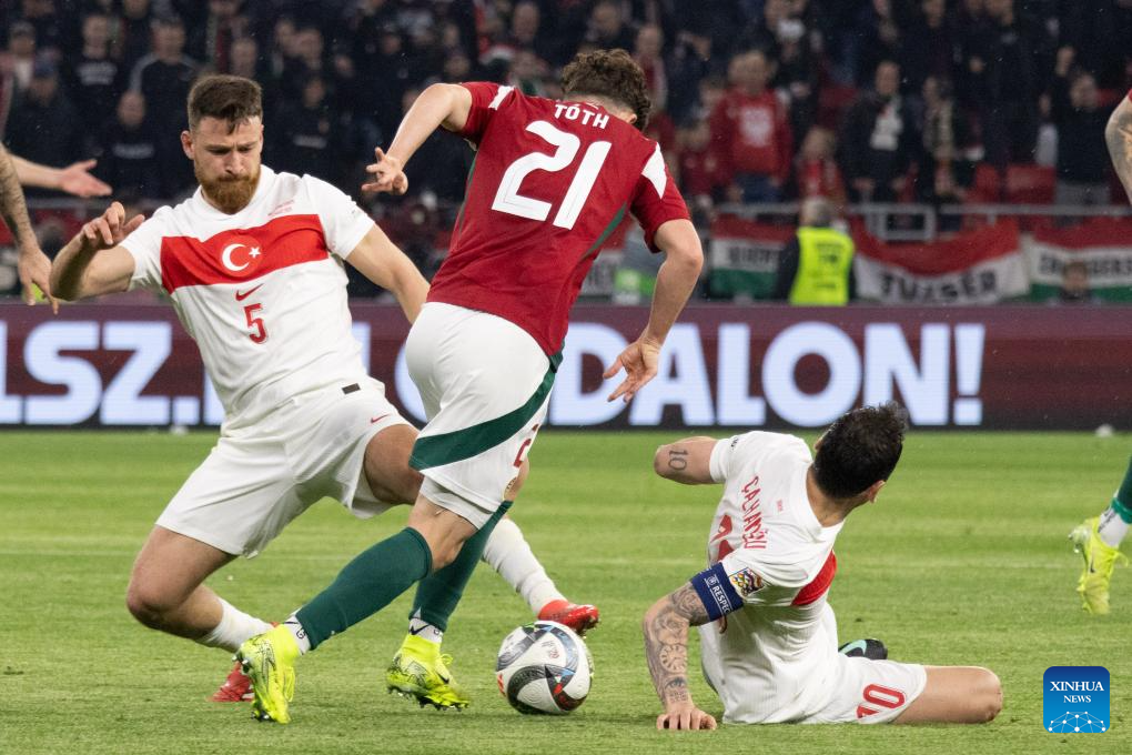 Alex Toth (C) of Hungary vies with Salih Ozcan (L) and Hakan Calhanoglu of Türkiye during the UEFA Nations League play-offs 2nd leg football match between Hungary and Türkiye in Budapest, Hungary on March 23, 2025. (Photo by Attila Volgyi/Xinhua)