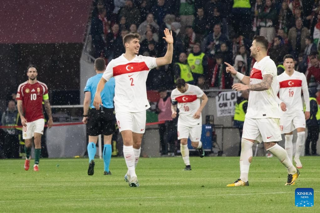 Arda Guler (3rd R) of Türkiye celebrates scoring during the UEFA Nations League play-offs 2nd leg football match between Hungary and Türkiye in Budapest, Hungary on March 23, 2025. (Photo by Attila Volgyi/Xinhua)