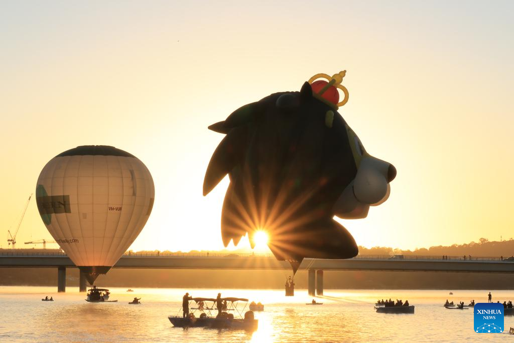 Hot air balloons fly over the Lake Burley Griffin during the annual Canberra Balloon Spectacular in Canberra, Australia, March 23, 2025. (Photo by Xiao Chongming/Xinhua)
