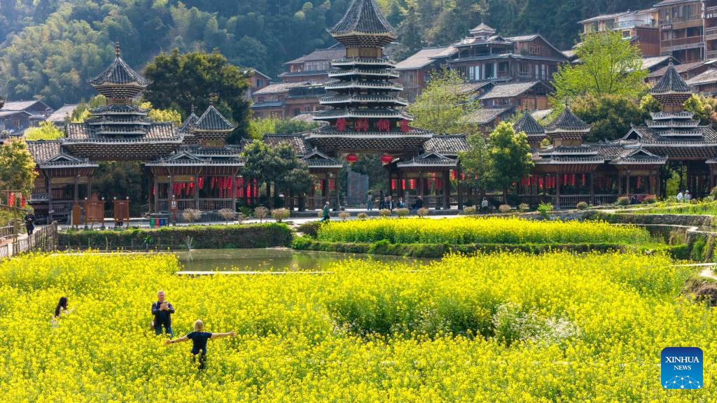 Tourists enjoy themselves among rapeseed flowers at the Zhaoxing Dong Village in Liping County of Qiandongnan Miao and Dong Autonomous Prefecture, southwest China's Guizhou Province, March 22, 2025. (Photo by Long Jianrui/Xinhua)