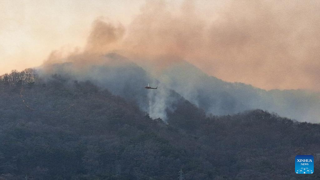 A helicopter conducts a firefighting mission in South Gyeongsang province, South Korea, March 22, 2025. The South Korean government declared a state of disaster on Saturday over wildfires that broke out in the country's southeastern areas including Ulsan city, North Gyeongsang province and South Gyeongsang province, the Ministry of the Interior and Safety said. (NEWSIS via Xinhua)