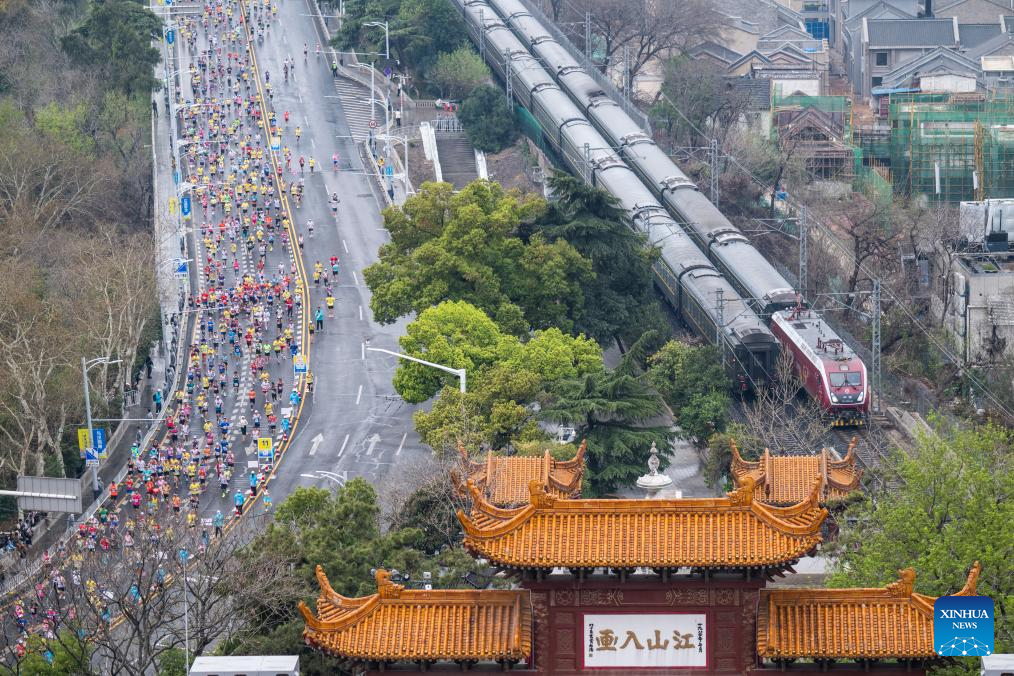 Participants run past Huanghelou, or Yellow Crane Tower, during the Wuhan Marathon in Wuhan, central China's Hubei Province, March 23, 2025. (Xinhua/Wu Zhizun)