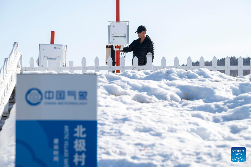 Meteorologist Qu Bo checks equipment at the Arctic Village National Basic Meteorological Station in Mohe, northeast China's Heilongjiang Province, March 22, 2025. China's northernmost meteorological station, the Arctic Village National Basic Meteorological Station, located in Beijicun, or "North Pole Village" in Mohe City, has four meteorologists. They patrol the meteorological observation equipment, and conduct atmospheric detection and temperature monitoring of cold-region buildings.