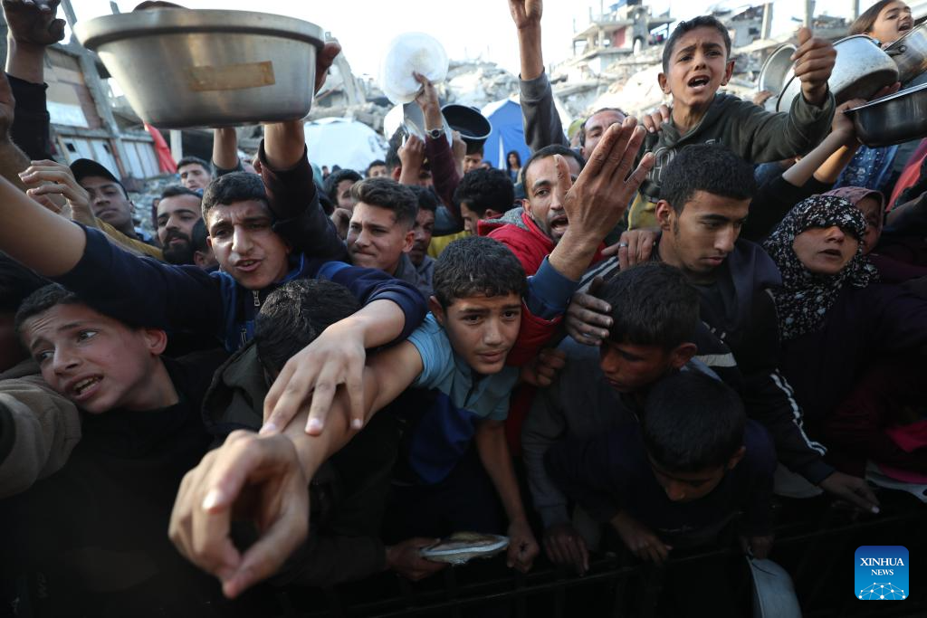 Palestinians wait to receive free food from a food distribution center in Beit Lahia, northern Gaza Strip, on March 22, 2025. (Photo by Mahmoud Zaki/Xinhua)