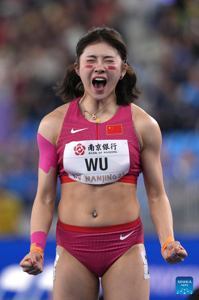 Wu Yanni of China celebrates after breaking the national record during the women's 60m hurdles semifinals at the 2025 World Athletics Indoor Championships in Nanjing, east China's Jiangsu Province, March 23, 2025. (Xinhua/Li Bo)