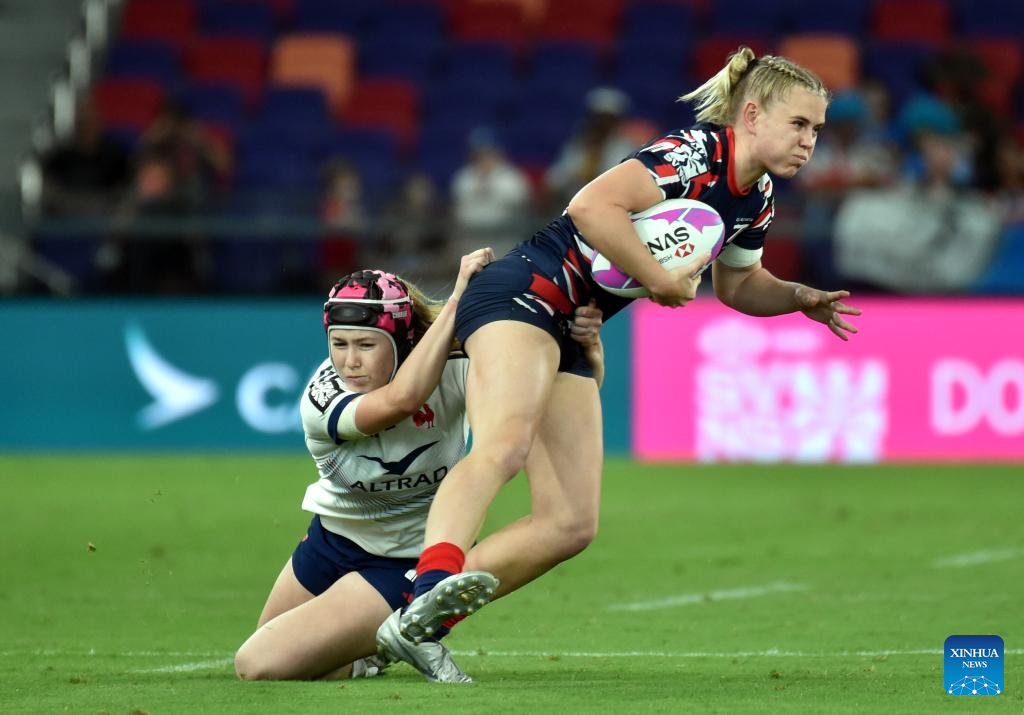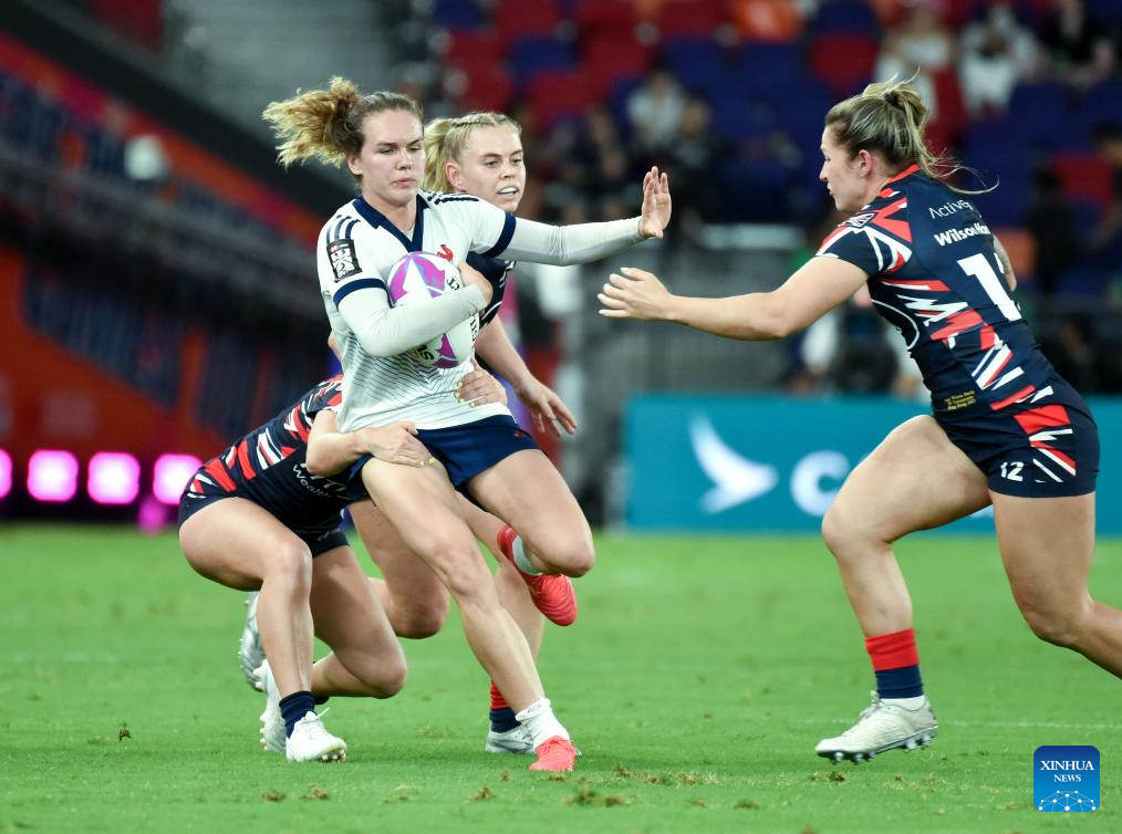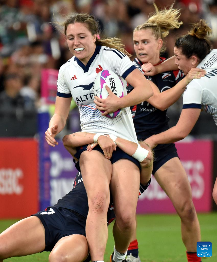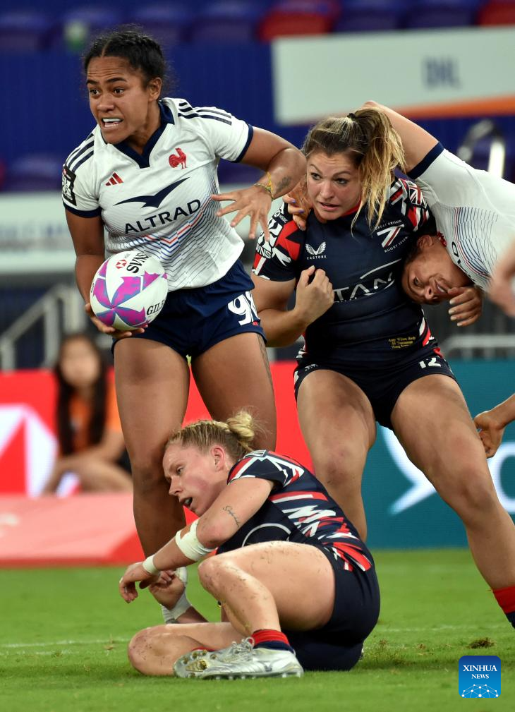 Rose Marie Fiafialoto (1st L) of France competes during the women's pool B match between France and Britain at World Rugby Sevens Series 2025 in south China's Hong Kong, March 28, 2025. (Xinhua/Lo Ping Fai)