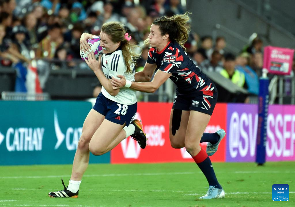 Charlie Gauyat (L) of France defends Grace Crompton of Britain during the women's pool B match between France and Britain at World Rugby Sevens Series 2025 in south China's Hong Kong, March 28, 2025. (Xinhua/Lo Ping Fai)