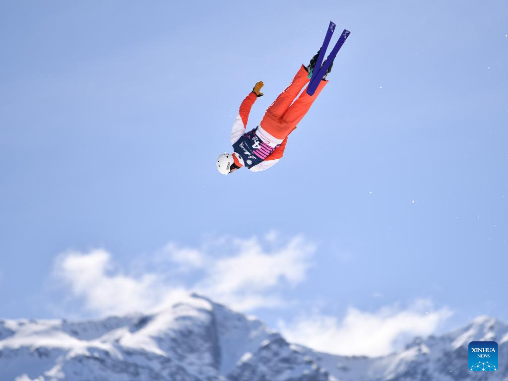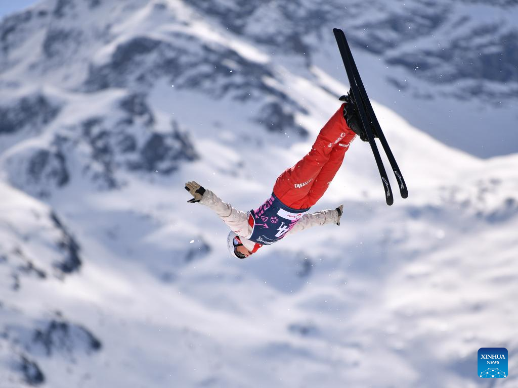 Lina Kozomara of Switzerland competes during the Freestyle Skiing mixed team aerials final at the 20th Freestyle World Ski Championships in St. Moritz, Switzerland, March 27, 2025. (Xinhua/Lian Yi)