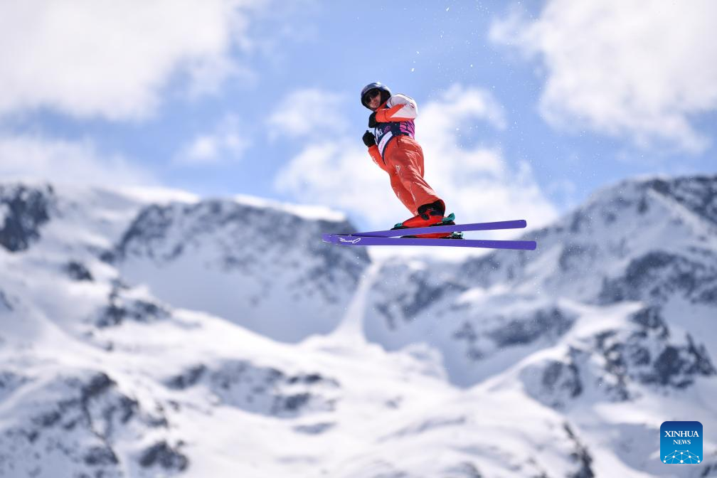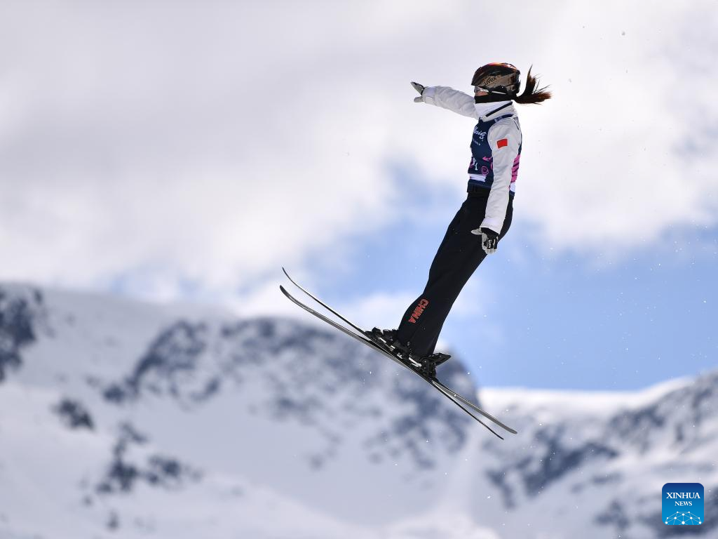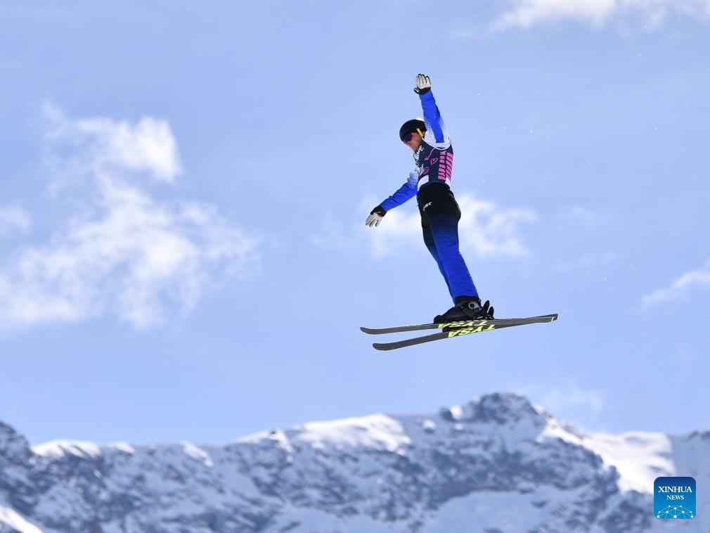 Wang Xindi of China competes during the Freestyle Skiing mixed team aerials final at the 20th Freestyle World Ski Championships in St. Moritz, Switzerland, March 27, 2025. (Xinhua/Lian Yi)