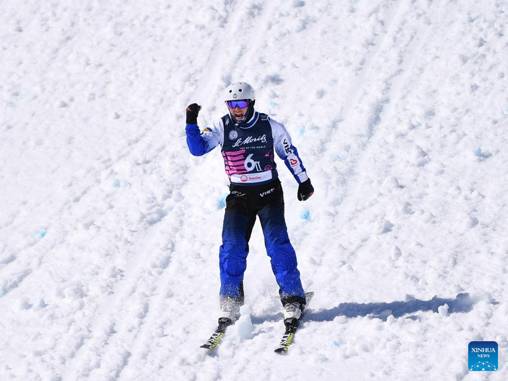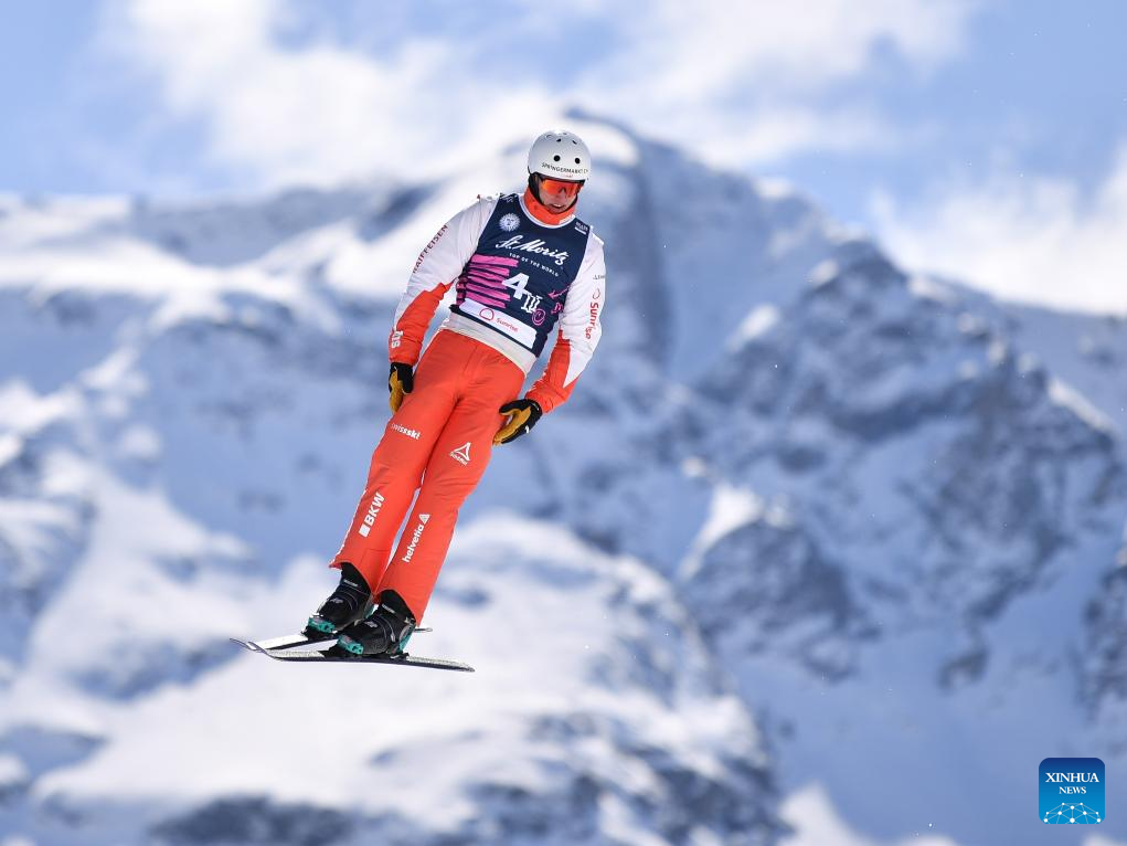 Pirmin Werner of Switzerland competes during the Freestyle Skiing mixed team aerials final at the 20th Freestyle World Ski Championships in St. Moritz, Switzerland, March 27, 2025. (Xinhua/Lian Yi)
