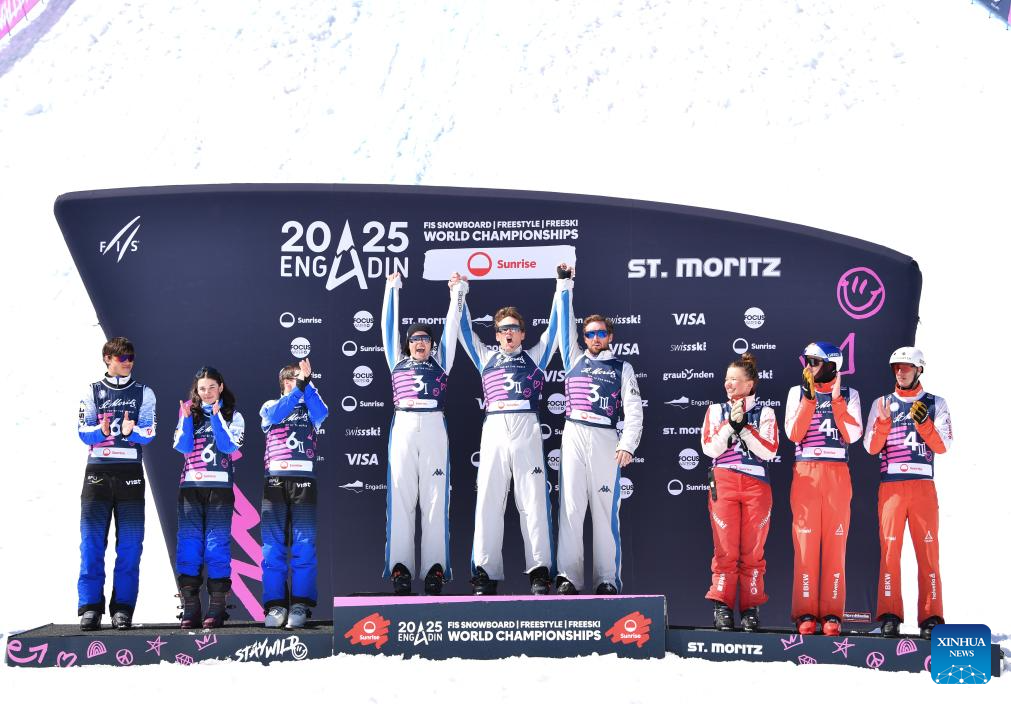 Gold medalists team USA (C), silver medalists team Ukraine (L) and bronze medalists team Switzerland celebrate during the awarding ceremony for the Freestyle Skiing mixed team aerials event at the 20th Freestyle World Ski Championships in St. Moritz, Switzerland, March 27, 2025. (Xinhua/Lian Yi)