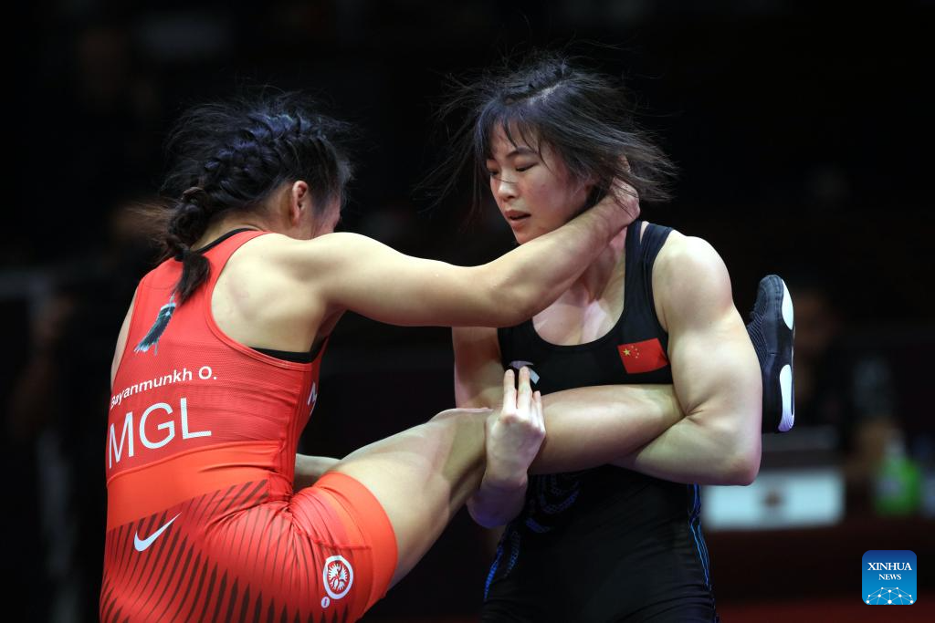 China's Li Yuxuan (R) competes against Mongolia's Otgontuya Bayanmunkh during the women's 55kg semifinal match at the Senior Asian Wrestling Championships in Amman, Jordan, March 27, 2025. (Photo by Mohammad Abu Ghosh/Xinhua)