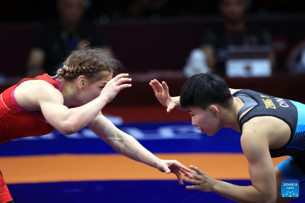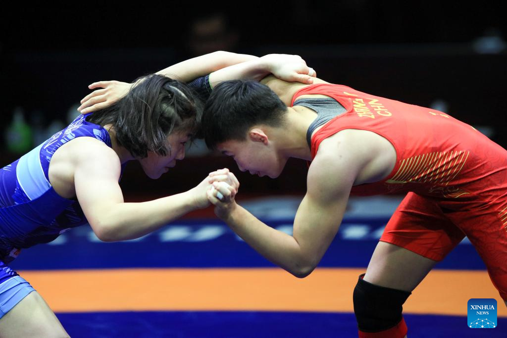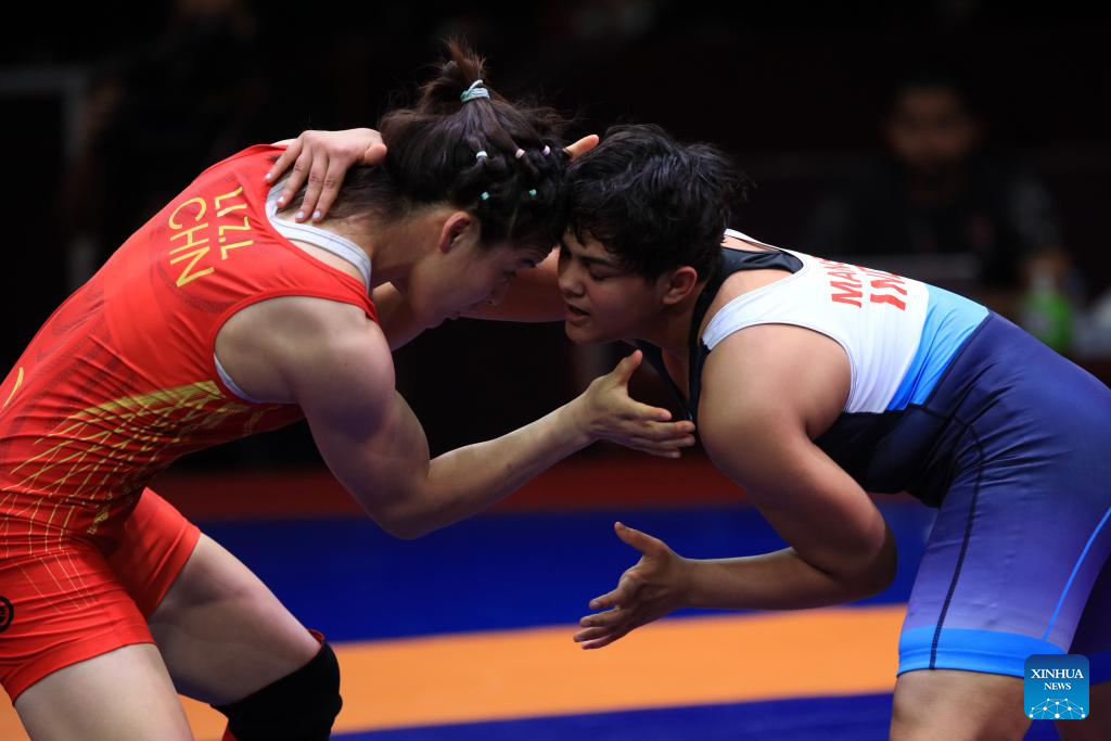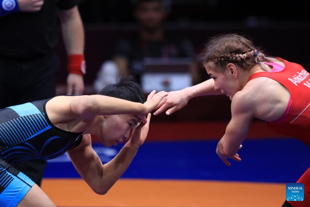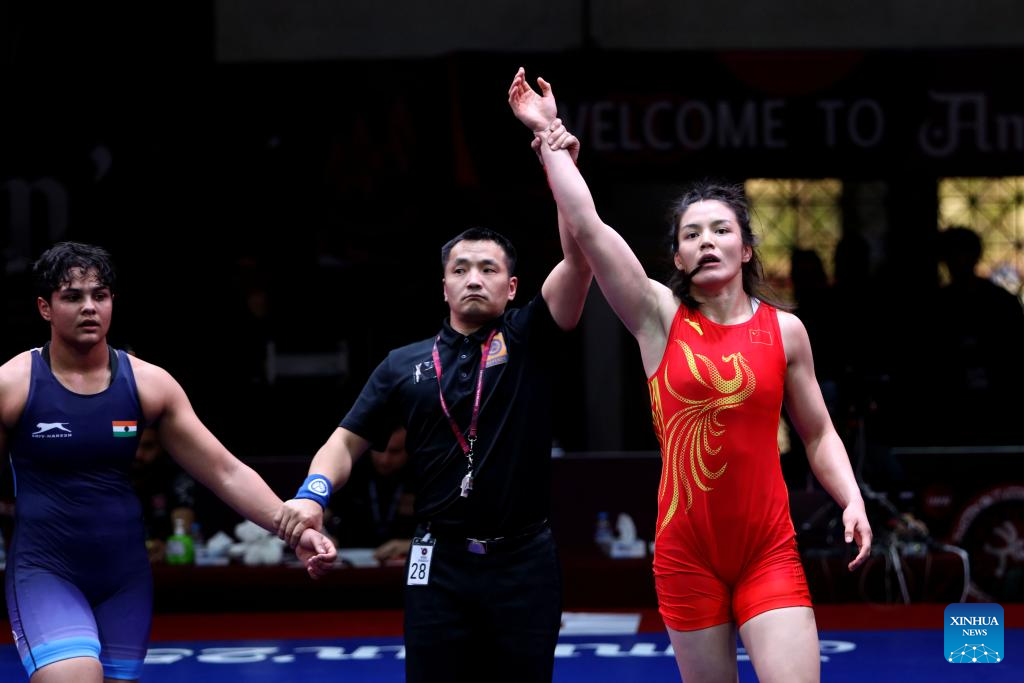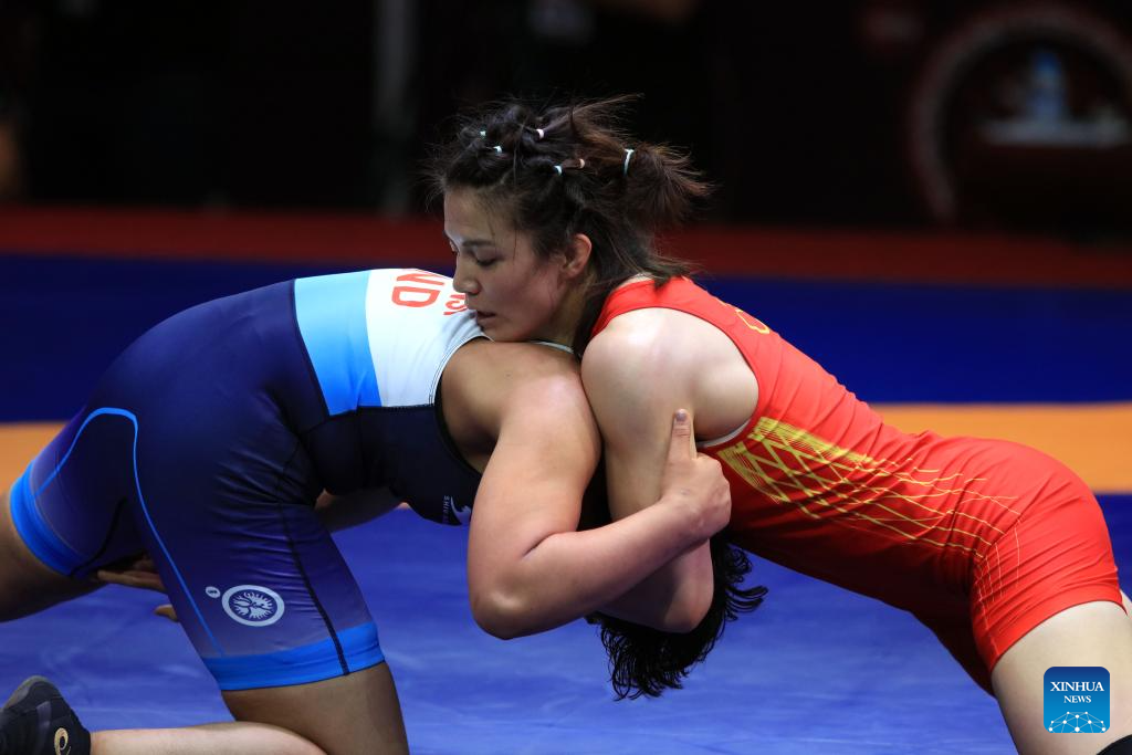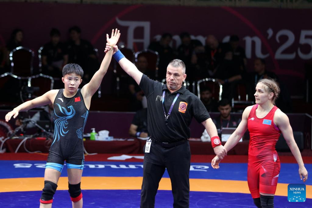 China's Zhang Yu (L) wins the women's 50kg semifinal match against Kazakhstan's Svetlana Ankicheva at the Senior Asian Wrestling Championships in Amman, Jordan, March 27, 2025. (Photo by Mohammad Abu Ghosh/Xinhua)